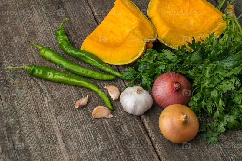 Лук, тыква, чеснок, перец, кориандр и петрушка на старой деревянной доске