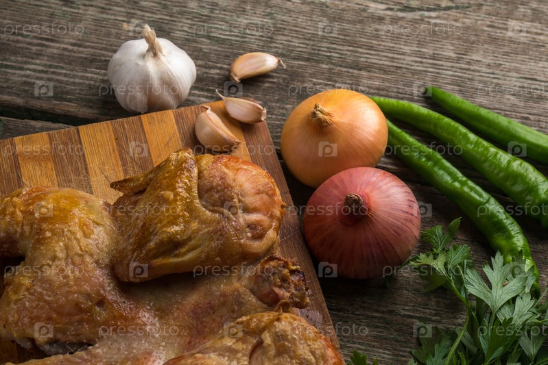 Жареный цыпленок и овощи на старой деревянной доске