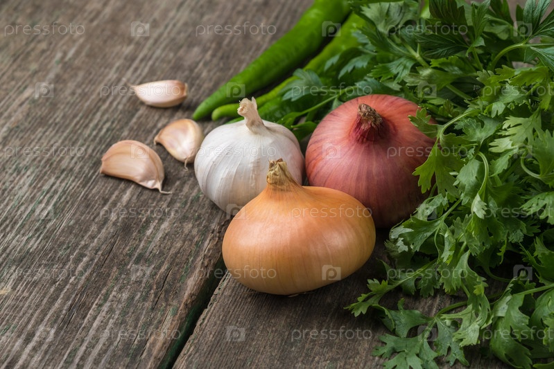 Овощи и зелень на старой деревянной доске