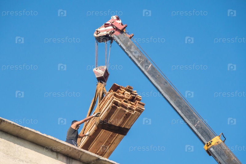 Кран поднимает деревянные рейки на крышу