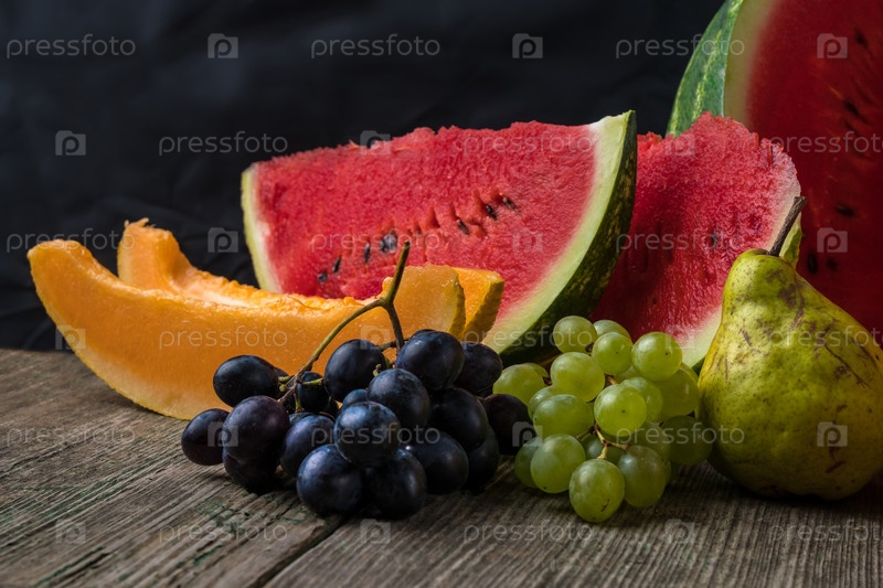 Арбузы, дыни, виноград, персик, груша, тыква на старом деревянном столе