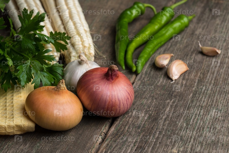 Овощи и зелень на старой деревянной доске