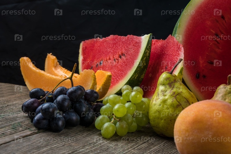 Арбузы, дыни, виноград, персик, груша, тыква на старом деревянном столе