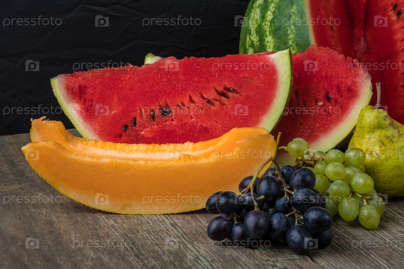 Арбузы, дыни, виноград, персик, груша, тыква на старом деревянном столе