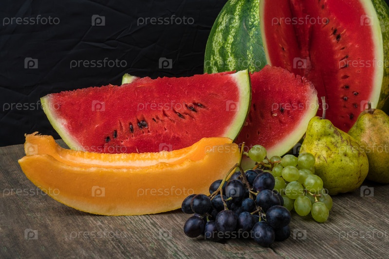 Арбузы, дыни, виноград, персик, груша, тыква на старом деревянном столе
