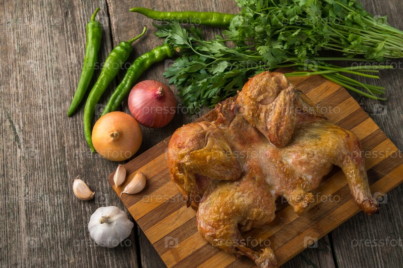 Жареный цыпленок и овощи на старой деревянной доске