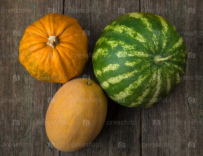 Арбуз, дыня и тыква на старый деревянный стол