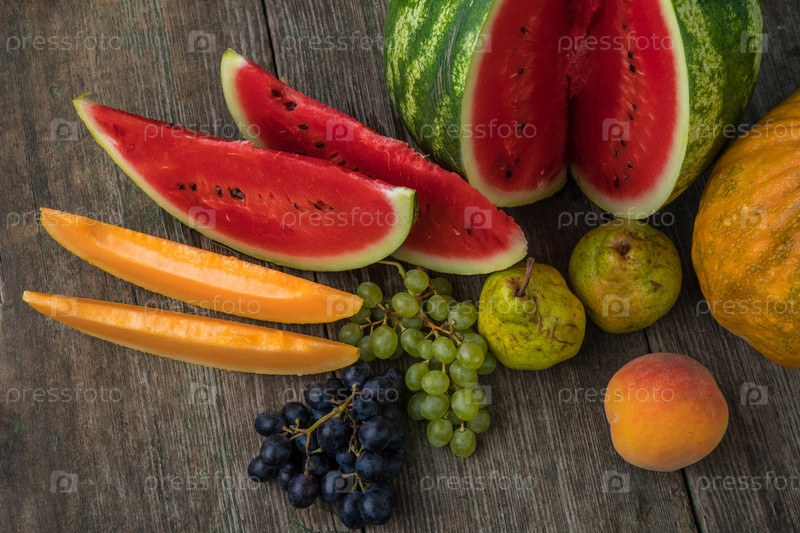 Арбузы, дыни, виноград, персик, груша, тыква на старом деревянном столе