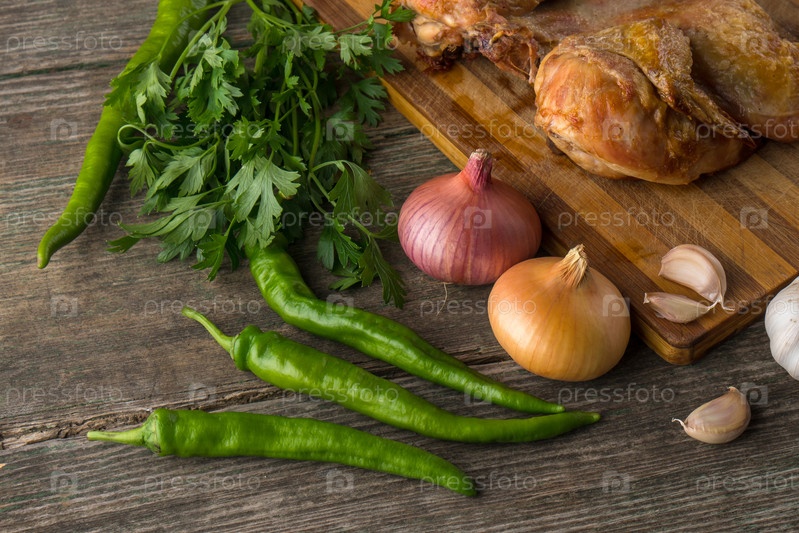 Жареный цыпленок и овощи на старой деревянной доске