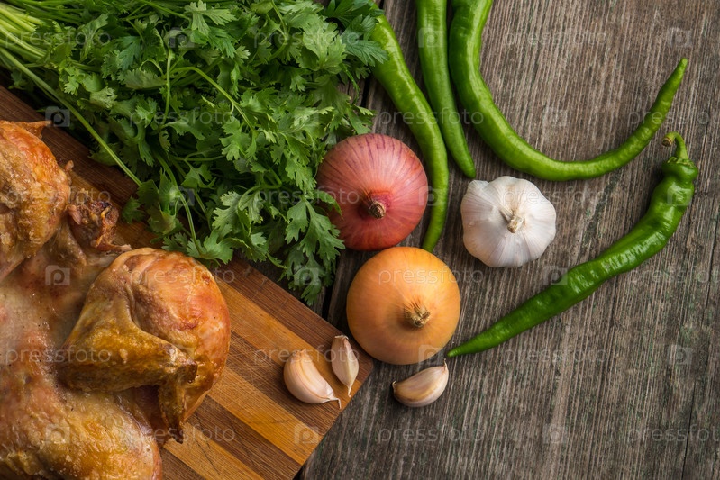 Жареный цыпленок и овощи на старой деревянной доске