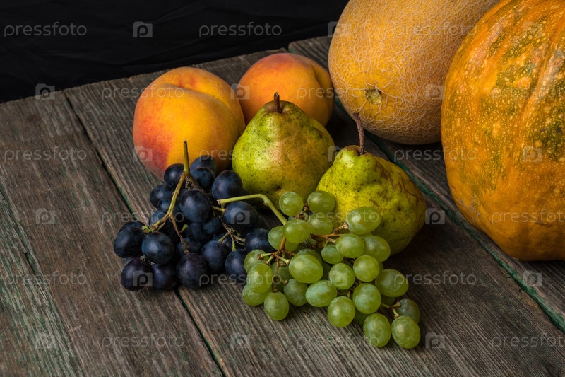 Дыня, виноград, персик, груша и тыква на старом деревянном столе