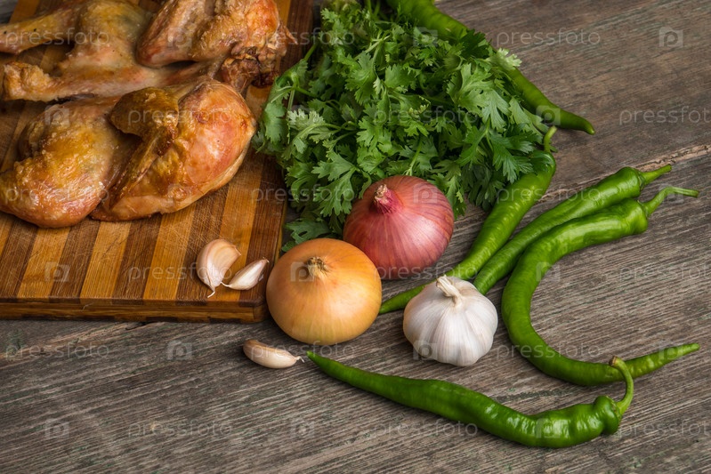 Жареный цыпленок и овощи на старой деревянной доске