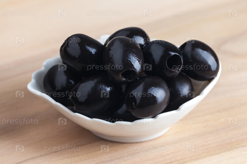 Миска с черными оливками на деревянном столе