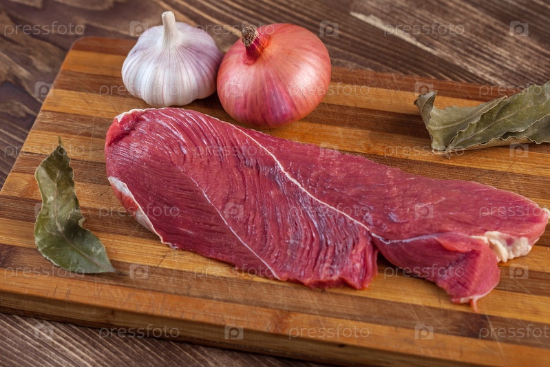 Мясо, лавровый лист, чеснок и лук на разделочной доске