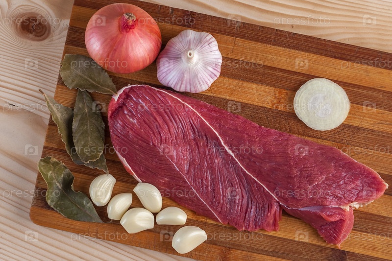Мясо, лавровый лист, чеснок и лук на разделочной доске