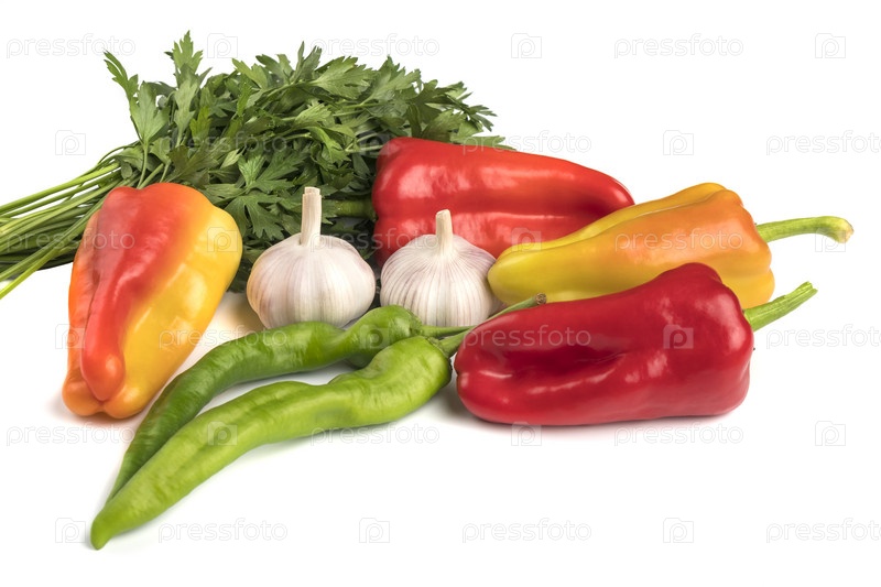 Свежие овощи (перец, чеснок, петрушка) на белом фоне