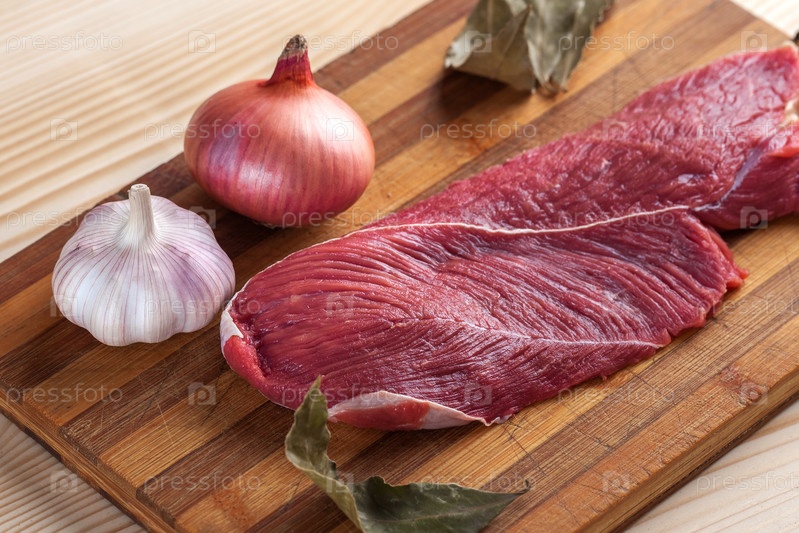 Мясо, лавровый лист, чеснок и лук на разделочной доске