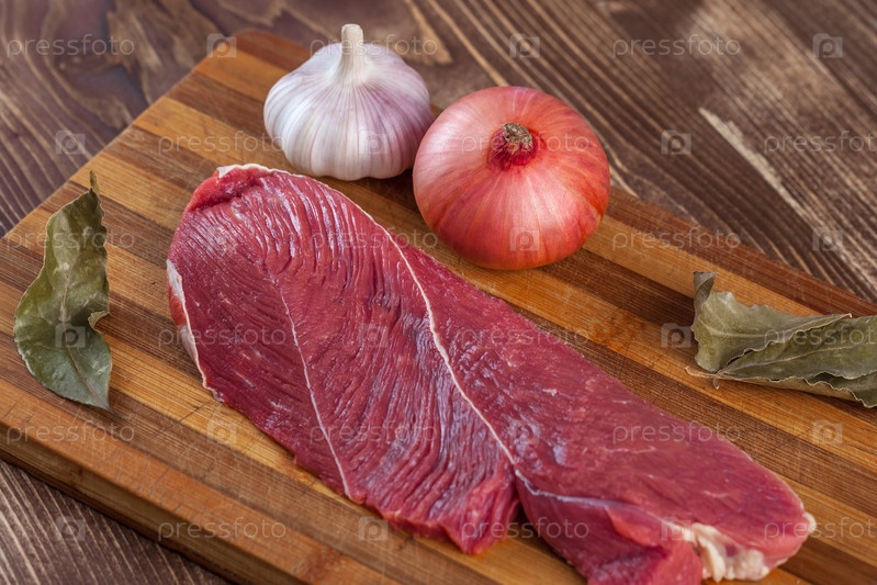 Мясо, лавровый лист, чеснок и лук на разделочной доске
