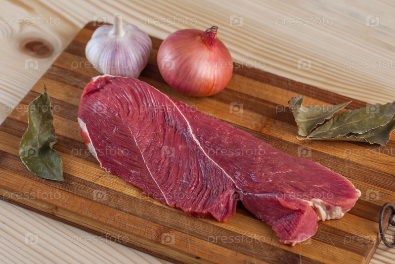 Мясо, лавровый лист, чеснок и лук на разделочной доске