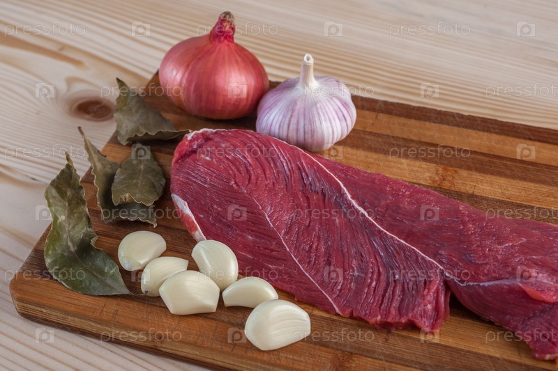 Мясо, лавровый лист, чеснок и лук на разделочной доске