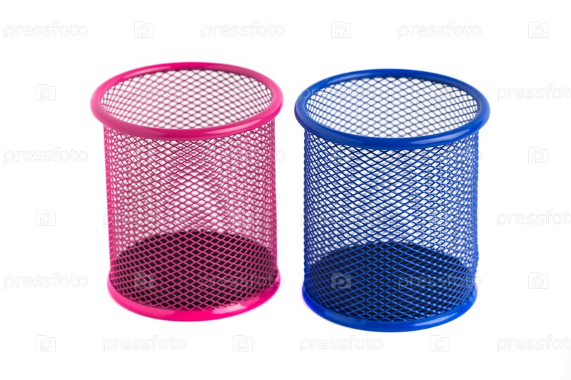 Красная и синяя корзины для ручек и карандашей на белом фоне