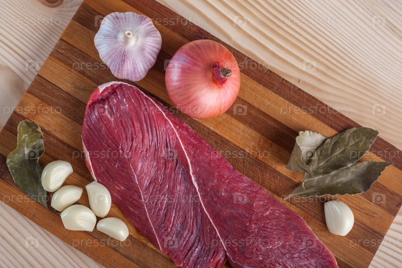 Мясо, лавровый лист, чеснок и лук на разделочной доске