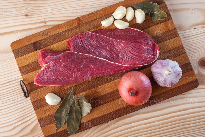 Мясо, лавровый лист, чеснок и лук на разделочной доске