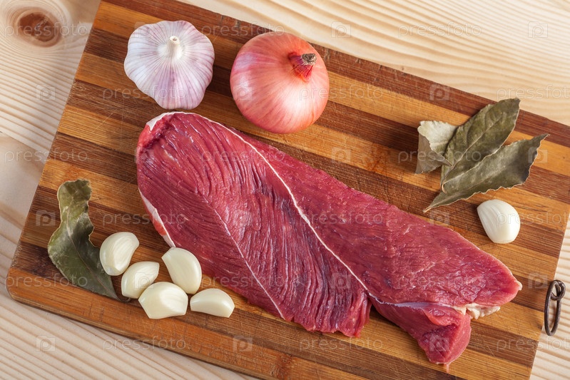Мясо, лавровый лист, чеснок и лук на разделочной доске