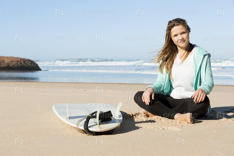 Серфер девушка сидит на пляже