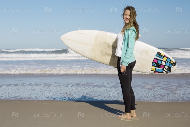Девушка на пляже с доской для серфинга