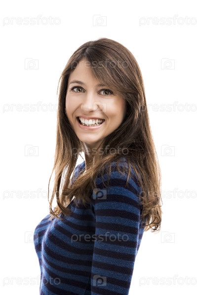 Красивая и счастливая женщина улыбается на белом фоне