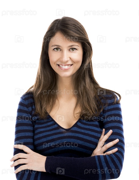 Красивая и счастливая женщина улыбается на белом фоне