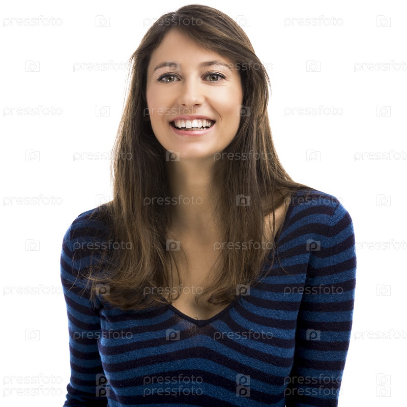 Красивая и счастливая женщина улыбается на белом фоне