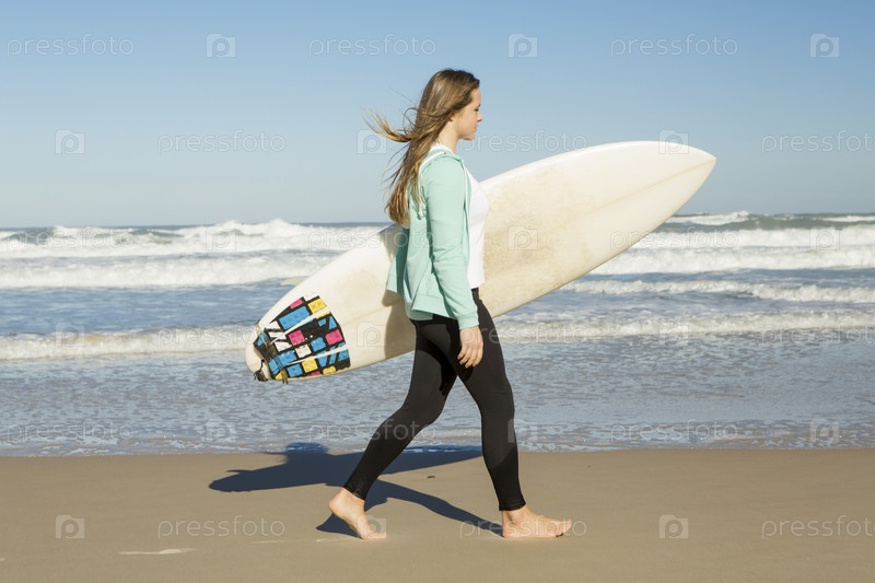 Девушка, идущая на пляже с доской для серфинга