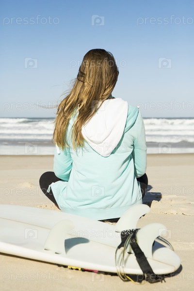 Серфер девушка сидит на пляже