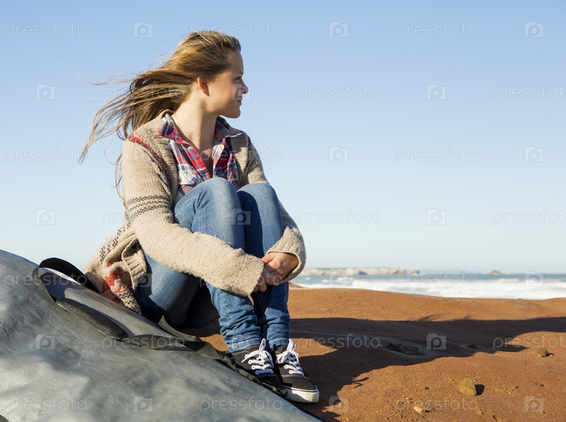 Девочка-подросток на пляже с доской для серфинга ждет волн