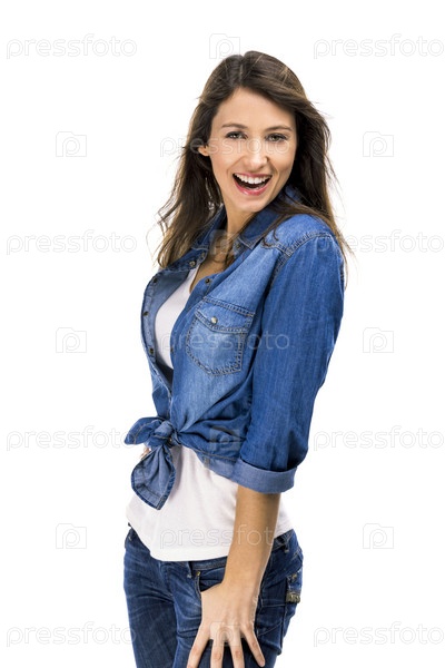 Красивая и привлекательная женщина носит джинсовую рубашку