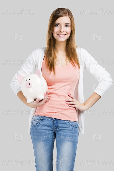 Светловолосая женщина с копилкой