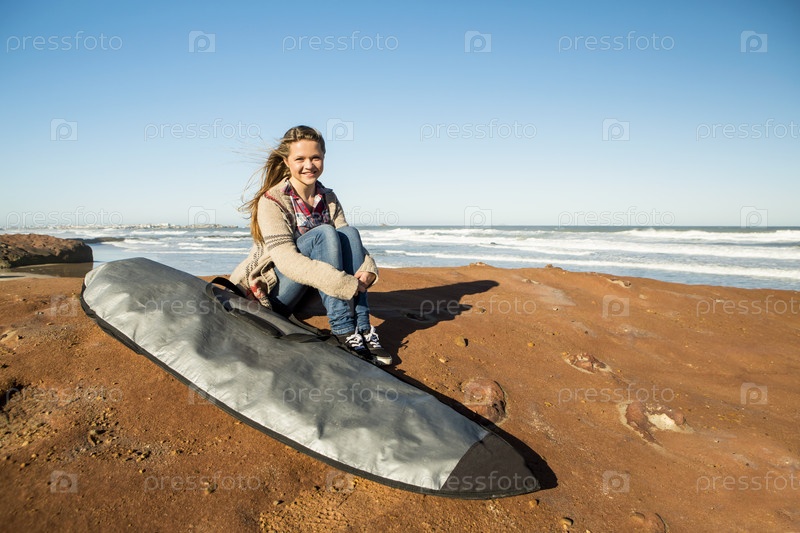 Девочка-подросток на пляже с доской для серфинга ждет волн