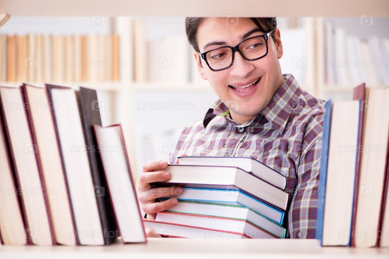 Молодой студент ищет книги в библиотеке колледжа