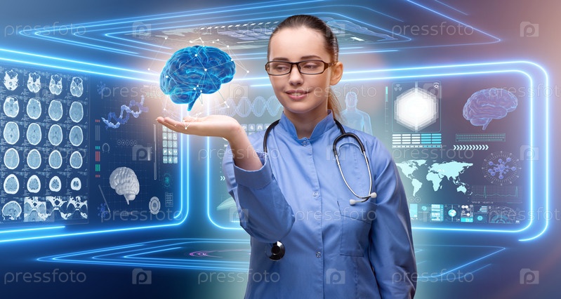 Женщина-врач с мозгом в медицинской концепции