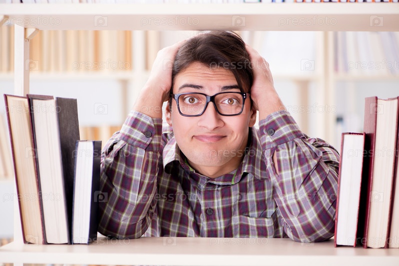 Молодой студент ищет книги в библиотеке колледжа