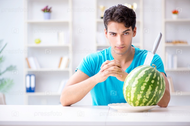 Человек ест арбуз дома