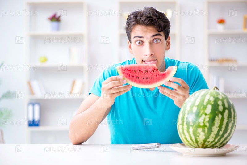 Человек ест арбуз дома