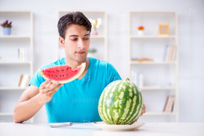 Человек ест арбуз дома
