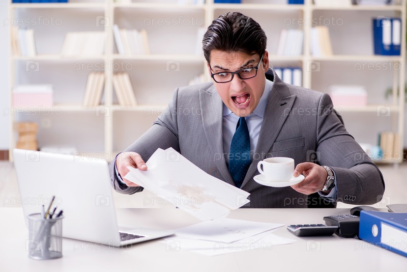 Бизнесмен проливает кофе на важные документы