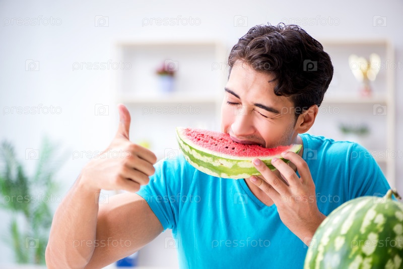 Человек ест арбуз дома