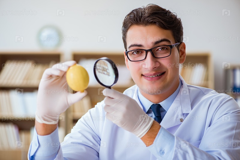 Ученый, изучает фрукты и овощи