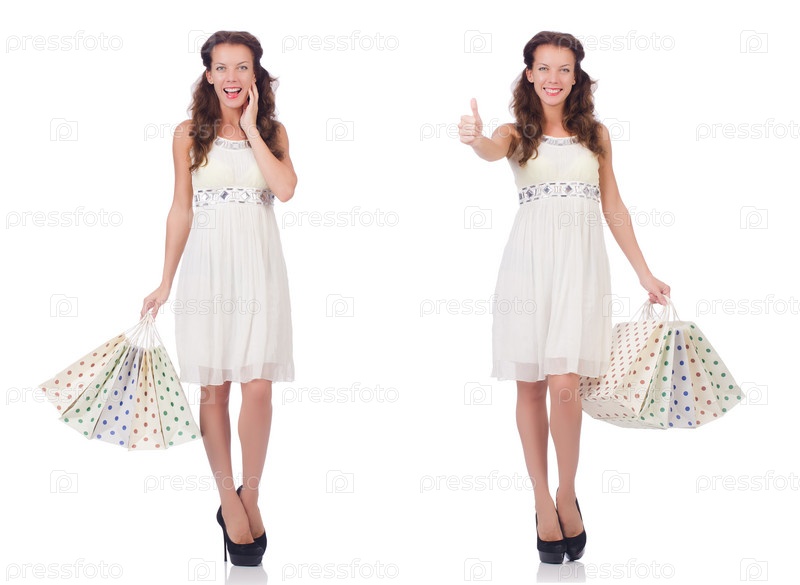 Женщина с хозяйственными сумками на белом