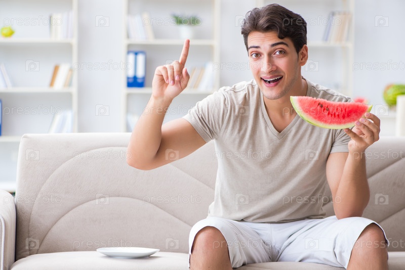 Человек ест арбуз дома